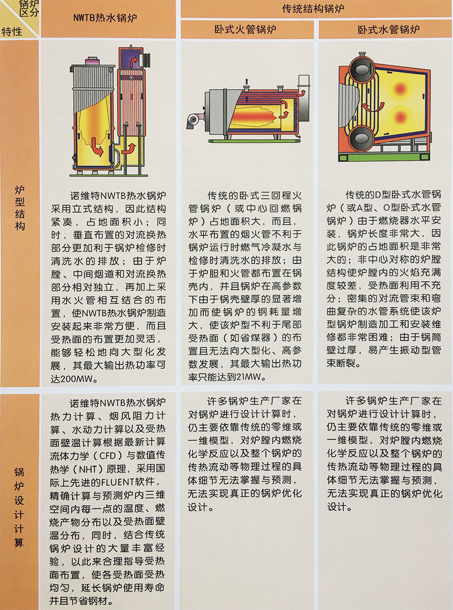 • 在七十年代以前,芬蘭大型燃?xì)饣蛴蜔崴仩t的尾部對流受熱面也采用水管蛇形管束的結(jié)構(gòu),這種傳統(tǒng)的結(jié)構(gòu)是在蒸汽鍋爐設(shè)計(jì)的基礎(chǔ)上改造而成的。結(jié)果運(yùn)行中發(fā)現(xiàn),這種結(jié)構(gòu)的管子極易被腐蝕,無論采用何種措施都無法從根本上減輕或避免腐蝕現(xiàn)象的發(fā)生,因此開發(fā)一種專門為熱水鍋爐設(shè)計(jì)的新型的結(jié)構(gòu),根本解決低溫腐蝕現(xiàn)象迫在眉睫。通過大量研究,芬蘭諾維特的創(chuàng)始人開發(fā)了NWTB型熱水鍋爐,顛覆了傳統(tǒng)的由燃煤蒸汽鍋爐改造成的熱水鍋爐的結(jié)構(gòu),而其中垂直布置的尾部對流火管受熱面從根本上解決了低溫腐蝕的現(xiàn)象。